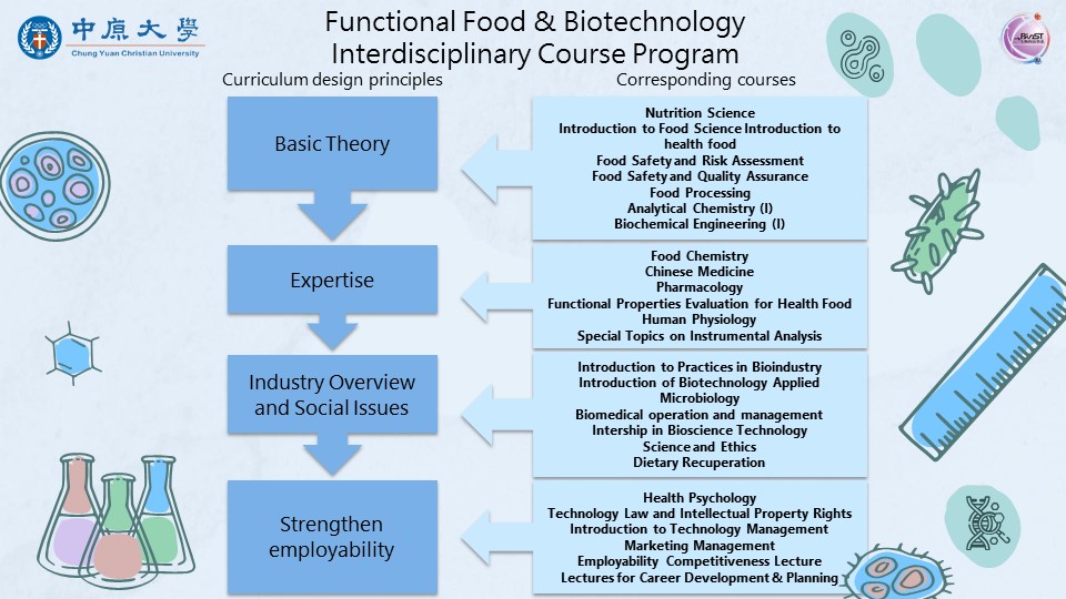 This program provides a series of interdisciplinary courses across multiple colleges, aiming to cultivate talented individuals with diverse expertise. Such training will contribute significantly to the development of Taiwan’s biotechnology and health food industry, as well as to students’ future employment, entrepreneurship, and innovation.